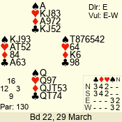 | Con | Dc | Res | Score | Ld | Pairs | Rd | Tbl | | 2 NT | E | = | -120 | 3 | 10 - 06 | 8 | 5 |