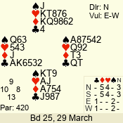 | Con | Dc | Res | Score | Ld | Pairs | Rd | Tbl | | 1 NT | S | +2 | 150 | Q | 07 - 12 | 6 | 4 |