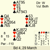| Con | Dc | Res | Score | Ld | Pairs | Rd | Tbl | | 2 NT | W | -4 | 400 | 5 | 11 - 04 | 7 | 6 |