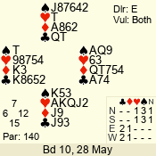 | Con | Dc | Res | Score | Ld | Pairs | Rd | Tbl | | 2 NT | S | +2 | 180 | 5 | 13 - 10 | 10 | 1 |