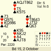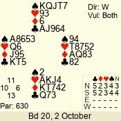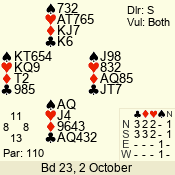 | Con | Dc | Res | Score | Ld | Pairs | Rd | Tbl | | 3 N | S | +1 | 630 | Q | 07 - 03 | 5 | 7 |