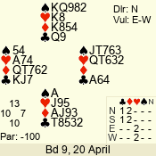| Con | Dc | Res | Score | Ld | Pairs | Rd | Tbl | | 3 NT | W | -2 | 100 | 2 | 05 - 09 | 9 | 5 |