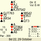 | Con | Dc | Res | Score | Ld | Pairs | Rd | Tbl | | 3 N | E | -1 | 50 | 4 | 02 - 03 | 9 | 2 |