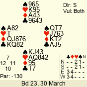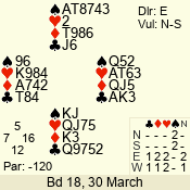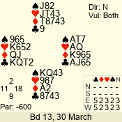 | Con | Dc | Res | Score | Ld | Pairs | Rd | Tbl | | 2 N | E | -2 | 200 | 4 | 04 - 15 | 20 | 4 |