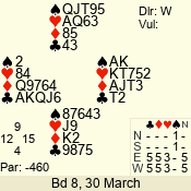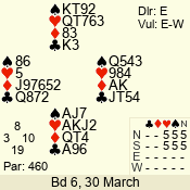 | Con | Dc | Res | Score | Ld | Pairs | Rd | Tbl | | 3 N | S | +2 | 460 | 2 | 01 - 11 | 6 | 1 |