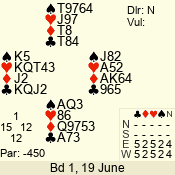 | Con | Dc | Res | Score | Ld | Pairs | Rd | Tbl | | 3 N | W | -4 | 400 | 2 | 01 - 11 | 3 | 1 |