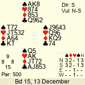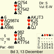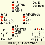 | Con | Dc | Res | Score | Ld | Pairs | Rd | Tbl | | 3 N | N | +3 | 490 | 4 | 04 - 02 | 3 | 4 |