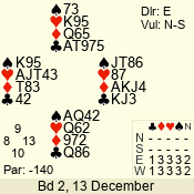 | Con | Dc | Res | Score | Ld | Pairs | Rd | Tbl | | 2 N | E | -1 | 100 | J | 02 - 03 | 4 | 2 |