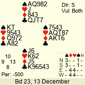 | Con | Dc | Res | Score | Ld | Pairs | Rd | Tbl | | 3 N | N | +3 | 490 | 4 | 04 - 02 | 3 | 4 |