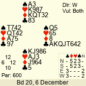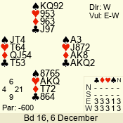 | Con | Dc | Res | Score | Ld | Pairs | Rd | Tbl | | 3 N | S | = | 600 | 2 | 03 - 06 | 5 | 3 |