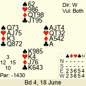 | Con | Dc | Res | Score | Ld | Pairs | Rd | Tbl | | 3 N | N | +1 | 430 | 3 | 04 - 07 | 5 | 4 |