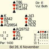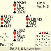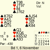 | Con | Dc | Res | Score | Ld | Pairs | Rd | Tbl | | 3 N | S | +1 | 430 | K | 02 - 05 | 8 | 5 |
