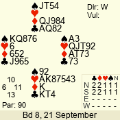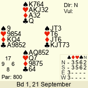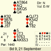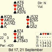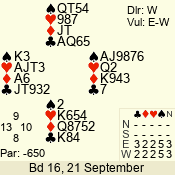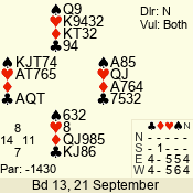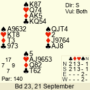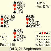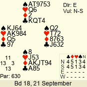 | Con | Dc | Res | Score | Ld | Pairs | Rd | Tbl | | 3 N | S | +1 | 630 | 6 | 04 - 08 | 13 | 4 |