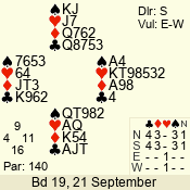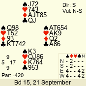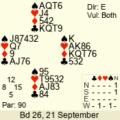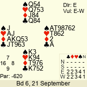 | Con | Dc | Res | Score | Ld | Pairs | Rd | Tbl | | 3 N | N | +1 | 630 | 7 | 06 - 01 | 6 | 6 |
