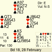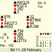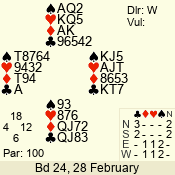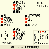 | Con | Dc | Res | Score | Ld | Pairs | Rd | Tbl | | 3 N | S | +1 | 630 | K | 01 - 05 | 8 | 6 |
