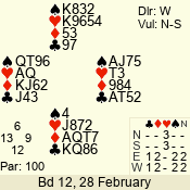 | Con | Dc | Res | Score | Ld | Pairs | Rd | Tbl | | 3 N | S | +4 | 720 | 6 | 09 - 03 | 5 | 1 |