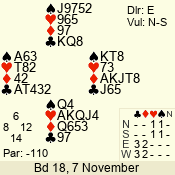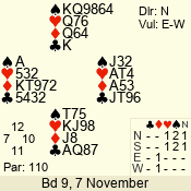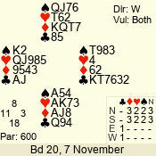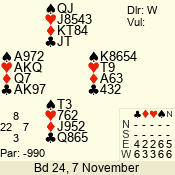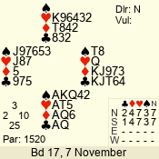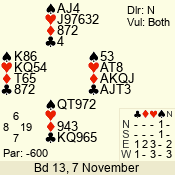 | Con | Dc | Res | Score | Ld | Pairs | Rd | Tbl | | 3 N | S | +1 | 630 | Q | 01 - 03 | 10 | 1 |
