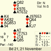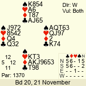 | Con | Dc | Res | Score | Ld | Pairs | Rd | Tbl | | 3 N | N | +1 | 430 | 6 | 04 - 04 | 11 | 4 |