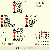 | Con | Dc | Res | Score | Ld | Pairs | Rd | Tbl | | 3 N | N | +2 | 460 | Q | 02 - 09 | 12 | 2 |