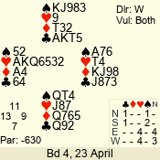 | Con | Dc | Res | Score | Ld | Pairs | Rd | Tbl | | 3 N | S | +1 | 630 | 5 | 03 - 04 | 10 | 3 |