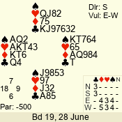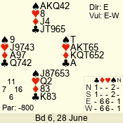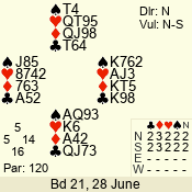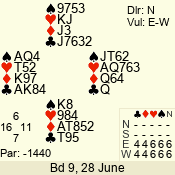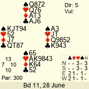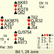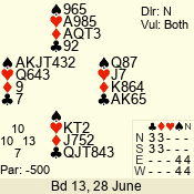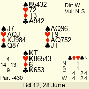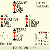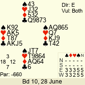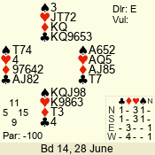 | Con | Dc | Res | Score | Ld | Pairs | Rd | Tbl | | 3 N | E | -1 | 50 | 3 | 05 - 03 | 3 | 5 |