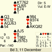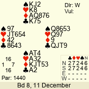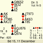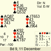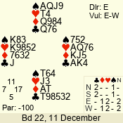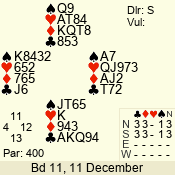 | Con | Dc | Res | Score | Ld | Pairs | Rd | Tbl | | 3 N | S | = | 400 | 9 | 08 - 09 | 11 | 8 |