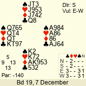 | Con | Dc | Res | Score | Ld | Pairs | Rd | Tbl | | 1 N | N | +3 | 180 | 7 | 03 - 03 | 1 | 3 |