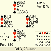 | 3 NT | S | +1 | 630 | 7 | 14 - 11 | 11 | 1 |
