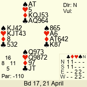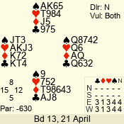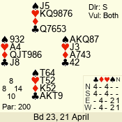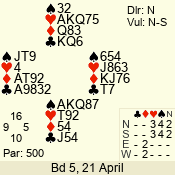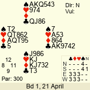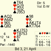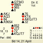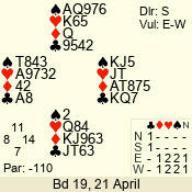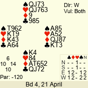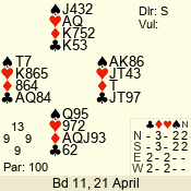 | Con | Dc | Res | Score | Ld | Pairs | Rd | Tbl | | 3 N | S | = | 400 | 8 | 04 - 04 | 1 | 4 |