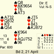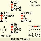 | Con | Dc | Res | Score | Ld | Pairs | Rd | Tbl | | 3 N | S | +2 | 660 | 6 | 05 - 02 | 4 | 5 |