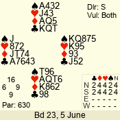 | Con | Dc | Res | Score | Ld | Pairs | Rd | Tbl | | 3 NT | N | +1 | 630 | 7 | 06 - 01 | 6 | 6 |