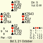 | Con | Dc | Res | Score | Ld | Pairs | Rd | Tbl | | 1 N | N | +1 | 120 | 3 | 02 - 02 | 10 | 2 |