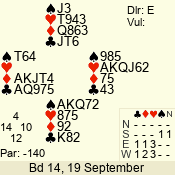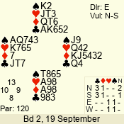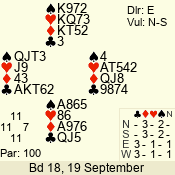 | Con | Dc | Res | Score | Ld | Pairs | Rd | Tbl | | 2 N | E | -1 | 100 | 3 | 09 - 02 | 8 | 9 |