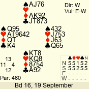 | Con | Dc | Res | Score | Ld | Pairs | Rd | Tbl | | 3 N | S | +2 | 460 | 6 | 05 - 02 | 4 | 5 |