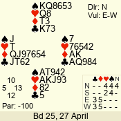 | Con | Dc | Res | Score | Ld | Pairs | Rd | Tbl | | 3 N | E | -1 | 50 | 4 | 06 - 07 | 11 | 6 |