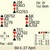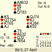 | Con | Dc | Res | Score | Ld | Pairs | Rd | Tbl | | 3 N | S | +2 | 460 | 4 | 04 - 05 | 11 | 4 |