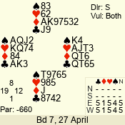 | Con | Dc | Res | Score | Ld | Pairs | Rd | Tbl | | 3 N | N | +2 | 660 | 8 | 01 - 01 | 12 | 1 |