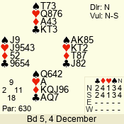 | Con | Dc | Res | Score | Ld | Pairs | Rd | Tbl | | 3 N | N | +1 | 630 | 5 | 11 - 08 | 5 | 2 |