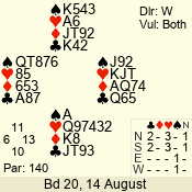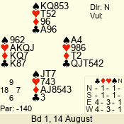 | Con | Dc | Res | Score | Ld | Pairs | Rd | Tbl | | 3 N | N | +1 | 630 | 5 | 17 - 12 | 13 | 4 |