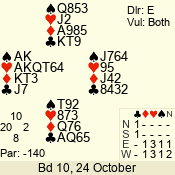| Con | Dc | Res | Score | Ld | Pairs | Rd | Tbl | | 3 N | N | +2 | 660 | J | 09 - 01 | 9 | 9 |