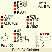 | Con | Dc | Res | Score | Ld | Pairs | Rd | Tbl | | 3 N | N | = | 400 | 5 | 05 - 07 | 8 | 5 |