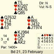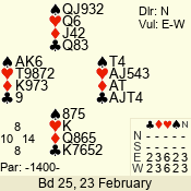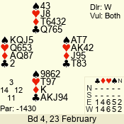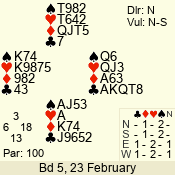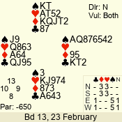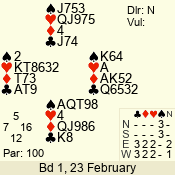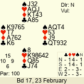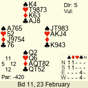 | Con | Dc | Res | Score | Ld | Pairs | Rd | Tbl | | 1 N | S | +1 | 120 | 3 | 07 - 07 | 1 | 7 |