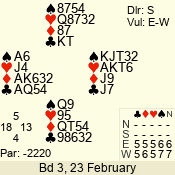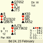| Con | Dc | Res | Score | Ld | Pairs | Rd | Tbl | | 3 N | N | +2 | 660 | 6 | 04 - 02 | 3 | 4 |