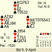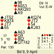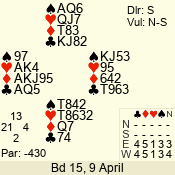 | Con | Dc | Res | Score | Ld | Pairs | Rd | Tbl | | 3 N | S | +1 | 630 | Q | 05 - 06 | 6 | 5 |
