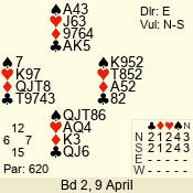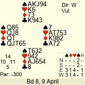 | Con | Dc | Res | Score | Ld | Pairs | Rd | Tbl | | 3 N | S | +2 | 460 | 8 | 01 - 06 | 2 | 1 |
