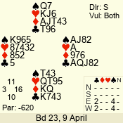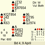 | Con | Dc | Res | Score | Ld | Pairs | Rd | Tbl | | 3 N | S | = | 600 | 4 | 03 - 03 | 1 | 3 |