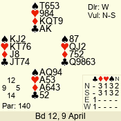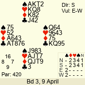 | Con | Dc | Res | Score | Ld | Pairs | Rd | Tbl | | 3 N | S | = | 600 | 4 | 03 - 03 | 1 | 3 |