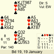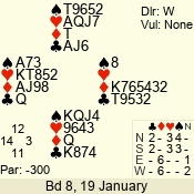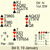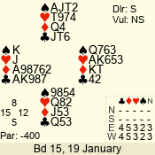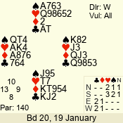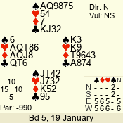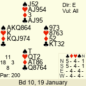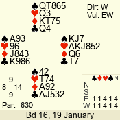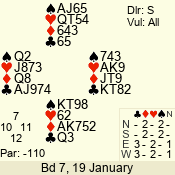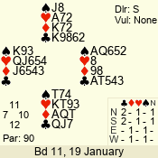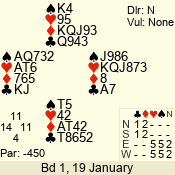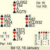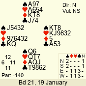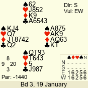 | Con | Dc | Res | Score | Ld | Pairs | Rd | Tbl | | 3 NT x | W | -1 | 200 | 3 | 03 - 01 | 7 | 3 |