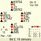 | Con | Dc | Res | Score | Ld | Pairs | Rd | Tbl | | 2 NT | W | -2 | 200 | 2 | 03 - 01 | 7 | 3 |