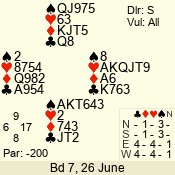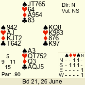 | Con | Dc | Res | Score | Ld | Pairs | Rd | Tbl | | 3 N x | E | -4 | 800 | 6 | 04 - 05 | 6 | 4 |